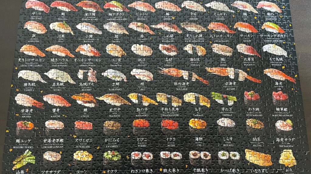 風景のパズルだと、似たような色が多いので絶対難しいだろうと思ったので、わかりやすそうなお寿司にしたのですが、それでもすごい難しかったです。